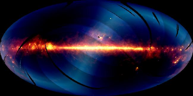 | Im Fern-Infraroten strahlt die Ebene der Milchstrasse hell (der hoizontale Band im Bild). Der Staub der Ebene der Ekliptik (mit darin unser Planetensytem) leuchtet als schwaches, S-förmiges Band quer durch das Bild. Die Streifigkeit ist ein Artefakt der Datenverarbeitung, die dunkle Gebiete sind Streifen ohne Messdaten. (Bild erarbeitet im IRAS Projekt; Link zu IRAS) |