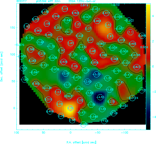 pointing J0010+110. Mars and other calibrators are at 80% flux, thus scale flux up by 1/0.8. tau_z=0.20, no anomalous refraction. 10 BODYT7 16/02/04 2453052.1835 1.9121 58.04 o 20040216_6099 11 BODYT7 16/02/04 2453052.1873 2.0028 57.17 o 20040216_6100 12 BODYT7 16/02/04 2453052.1911 2.0935 56.29 o 20040216_6101 13 BODYT7 16/02/04 2453052.1948 2.1844 55.39 o 20040216_6102 14 BODYT7 16/02/04 2453052.1986 2.2751 54.47 o 20040216_6103 15 BODYT7 16/02/04 2453052.2024 2.3658 53.54 o 20040216_6104 results of coadded scans 10-15: --------------------------------------------------- signal +- time reduction options mJy mJy sec 0.5799E+01 0.1029E+01 0.1125E+04 46-300 ph 0.6391E+01 0.1059E+01 0.1125E+04 100-300 ph <---- --------------------------------------------------- after recalibration: 8.0 +- 1.3 mJy