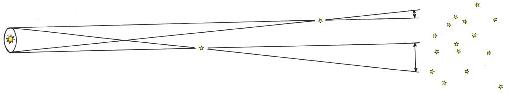 Die Spitzenwinkel (par) sind sehr klein und werden daher in Einheiten von Bogensekunden angegeben. Da der Spitzenwinkel kleiner ist je größer die Entfernung des Sterns, ist die Entfernung d des Objektes dann einfach proportional zum Kehrwert des Winkels, also d=1/par. Astronomen geben daher Entfernungen in Einheiten von parsec (Parallax-Sekunde = pc) an. Mit der Erdbahn als Basis sind die dazugehörigen Zahlen 1 pc = 206265 Erdbahnradien = 3.086 1013 km. Man kann Entfernungen auch in Einheiten von Lichtjahren angeben: eine Entfernung von 1 pc wird vom Licht in 3.26 Jahre zurückgelegt. (In der Sprache der populären Astronomie wird eine Entfernung immer in Einheiten von Lichtjahren angegeben, das hat sich eben so eingebürgert. Man verwendet für die "Übersetzung" manchmal einfach einen Faktor 3.3, oder sogar 3.) Es muss hier angemerkt werden, dass Entfernungen größer als etwa 100 pc mit irdischen Teleskopen nicht parallaktisch festgestellt werden können. Sehr große Entfernungen werden mit ganz anderen als parallaktischen Methoden bestimmt.