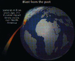| Skizze des Einschlagvorgangs vor 65 Millionen Jahren, wobei viel Wasser, Staub und Russ in die Erdatmosphäre gelangten. Die langjährige Abschattung der Sonnenstrahlung führte zum Aussterben der Dinosaurier. (Bild aus New Scientist) |