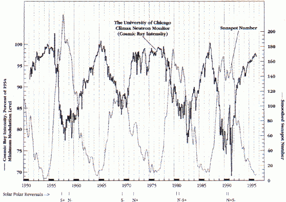| Variation der Wolkenbedeckung und der Instensität der kosmichen Strahlung. Wenn die kosmische Strahlung schwach ist, gibt es weniger Wolken. Schwache kosmische Strahlung bedeutet, dass die aktive Sonne uns vor solchen Teilchen schützt. (Bild aus "The Manic Sun", Nigel Calder) |