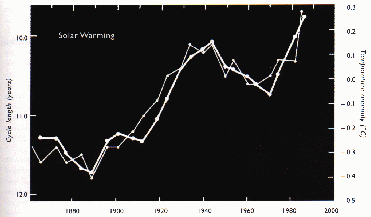 | Variation der Länge des Sonnenzyklus (dünne Kurve) zusammen mit der Änderung der mittleren Temperatur (dicke Kurve) der Erde. Erstaunlicherweise folgt die Temperatur sehr genau der Zykluslänge. Die Daten wurden zusammengestellt durch die dänischen Forschern Friis-Christensen & Lassen (1991). (Bild aus "The Manic Sun", Nigel Calder) |