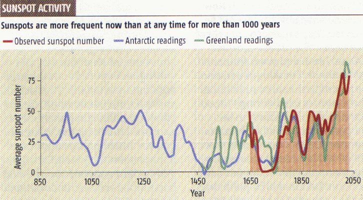 |   Mit der Modellierung der Sonnenaktivität im Vergleich mit ihrer Auswirkung auf Isotopenverhältnisse, sowie aus antarktischem und grönländischem Eis abgeleitet, kann man zurückrechnend feststellen, dass die Sonne jetzt so aktiv ist wie noch nie! (Vereinfachte Darstellung des Originaldiagramms, dem New Scientist 1 Nov. 2003, S. 17 entnommen) |