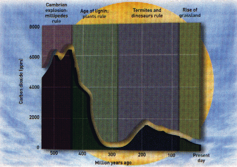 | Variation des Gehalts an CO2 in der Erdatmosphäre, zusammen mit Andeutungen über bedeutsame Stufen des Pflanzen- und Tierlebens. (Bild aus New Scientist No 2295 (16 Juni 2001), S. 30) |