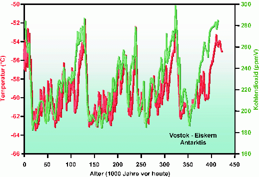 | Variation des Gehalts an CO2 (grün) in der Erdatmosphäre und der Temperatur (rot), wie aus dem Eis der Antarktis abgeleitet. Auf der Zeitachse ist heute links! (Bild aus Berner et al. : "Klimafakten", S. 105) |