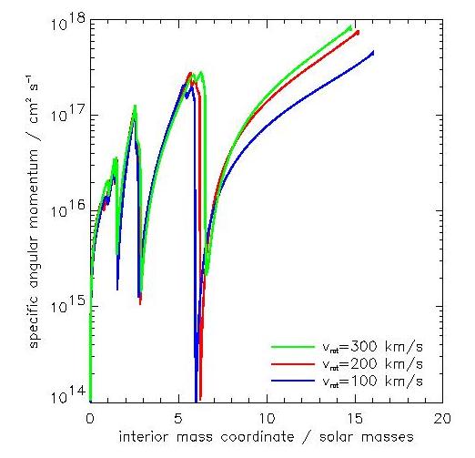 The distribution of specific angular momentum in the pre-collapse models of our 20M_sun evolutionary sequences with rotation. Note that the core angular momentum is almost independant of the initial rotation rate (see labels). In the frame of the collapsar model for gamma-ray bursts (cf. MAcFadyen and Woosley 1999, Astrophysical Journal Vol. 524, p.262), a gamma-ray burst might form if the collapsing iron core has a specific angular momentum of at least several 10**17 ccm/s. Our models,like the examples in the above figure, generally give smaller values! Find more details in our paper in Astrophysical Journal Vol. 528, pp. 368-396 (Jan. 1, 2000), or in Alexander Heger's PhD Thesis here .
