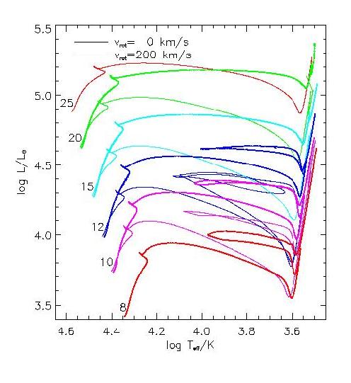 Evolutionary tracks of massive star in the Hertzsprung-Russell diagram. Effects of rotation are included in the thick-lined tracks, using an initial equatorial rotation velocity of 200 km/s. Different colors correspond to different initial masses, as indicated by the labels (initial mass in solar masses). The tracks end on the Zero Age Main Sequence (hydrogen ignition) and are computed until the cental iron core starts to colapse. Find more details in our paper in Astrophysical Journal Vol. 544, pp. 1016-1035 (Dec.1, 2000), or in Alexander Heger's PhD Thesis here .