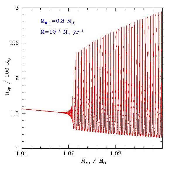 Radius of a CO-White Dwarf which accretes helium at a constant rate of 10**-6 solar masses per year, as function of its (growing) mass. The assumed initial white dwarf mass is 0.8 solar masses. As long as the white dwarf mass is smaller than 1.02 solar masses, the white dwarf burns the helium stably. But the burning becomes thermally unstable at larger mass, showing thermal pulses whose amplitude is growing in time. After about 50 thermal pulses, at a mass of about 1.04 solar masses (the end of our evolutionary sequence) the white dwarf reaches its Eddington-limit during a thermal pulse. This model, as a typical case, will have problems to ever reach the Chandrasekhar mass and produce a Type Ia Supernova. Find more details in our paper in Astronomy and Astrophysics Vol. 362, pp. 1046-1064 (2000), or in Silvia Scheithauer's Master Thesis here .