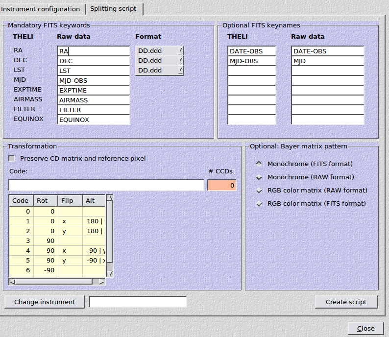 You must tell THELI the names of the FITS keywords in your data, such that your raw FITS header can be properly translated into a THELI-conform header. For some keys such as RA, DEC and LST you must define the format as well.