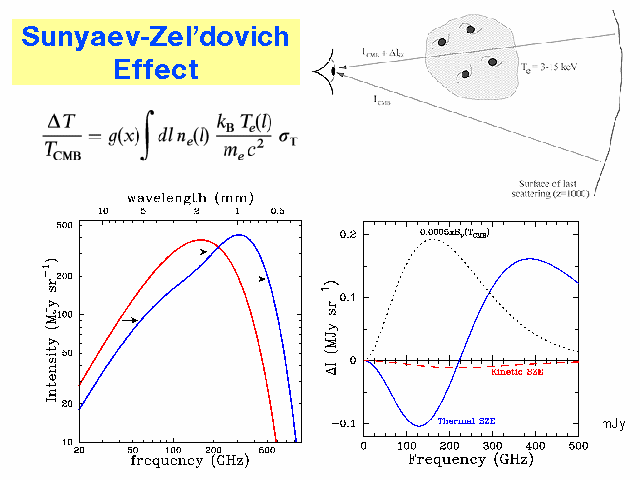 The Sunyaev-Zel'dovich (SZ) effect is the name given to the process by which the CMB blackbody spectrum is distorted by the presence of galaxy clusters. Galaxy clusters are the largest gravitationally-collapsed (virialized) structures in the universe, whose abundance and structure provide powerful probes of cosmology. Gas falling into the gravitational potential well of these clusters is heated to roughly 10^8 Kelvin and becomes ionized. Photons from the CMB pass through this ionized plasma, and as many as 1-2% of the CMB photons can be inverse Compton (Thompson) scattered by the hot gas. On average the energy of the scattered photons is increased, spectrally distorting the CMB in a characteric manner that is known as the thermal SZ effect. Deviations in intensity from the black-body ideal of the CMB are shown, as a function of frequency, as the blue line in the lower right graph. The intensity spectrum of the CMB is shown for comparison as a black dotted line, scaled by 5e-4. (The observing frequencies of the APEX SZ Survey, 150 GHz and 217 GHz, correspond to the decrement region and null region of the thermal SZ effect, respectively.)