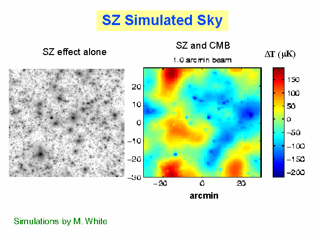 The left images shows a simulated SZ 150 GHz one square degree map computed from numerical cosmological evolution simulations. For the right images, to those SZ decrements the primary CMB anisotropy was added, and the image was convolved with a 1 arcmin beam. This is the sky that the APEX SZ camera will look at. We can see that to a detection limit of about 50-100 micro K, we should be able to identify some 10 clusters per square degree.