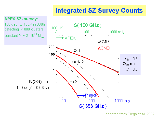 The integrated flux density distribution of clusters found in SZ surveys depends on cosmology and redshift. At redshifts below 1, an open CMD and a Lambda CMD model cannot be distinguished. At higher z however, the counts differ strongly.