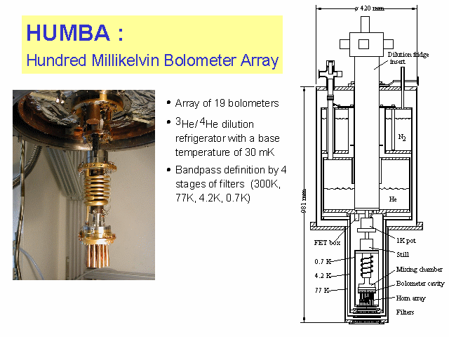 HUMBA is a 19 channel array operating in the 2mm atmospheric window. To avoid limitations by the system noise the bolometers are cooled to 100 mK by means of a 3He/4He dilution refrigerator.