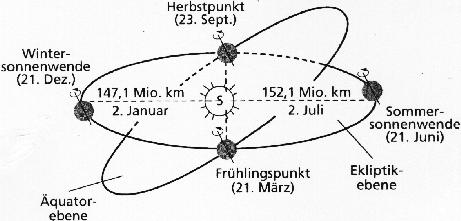 Die Erde umrundet die Sonne in einem Jahr. Etwa am 2. Januar bewegt sich die Erde in ihrer Bahn durch das Perihelium. Das Perihelium ist der Schnittpunkt der großen Halbachse mit der Erdbahn (links). Die Rotationsachse der Erde ist um 23 Grad gegenüber der Ekliptik geneigt. Die Richtung, in der die Rotationsachse geneigt ist, weicht um einige Grad ab von der Richtung der großen Bahnachse. Der Punkt in der Bahn, wo die Rotationsachse genau von der Sonne weg zeigt, bringt auf der Nordhemisphäre der Erde die Wintersonnenwende, das Winter-Solstitium am 21. Dezember. (Bild aus Astronomie, S. 51.) |