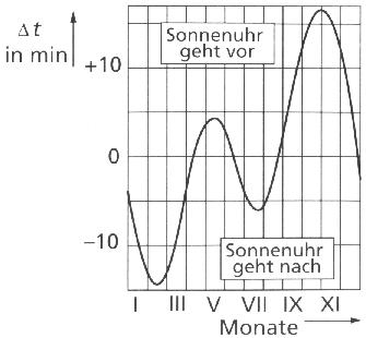Der Unterschied von "wahrer Zeit" und Sonnenzeit ändert sich im Laufe des Jahres so (die Zeitgleichung), dass (nach unseren Uhren mit der "wahren Zeit") die Nächte im Herbst scheinbar zu früh anfangen, diese Diskrepanz sich aber um den Jahreswechsel am schnellsten in die umgekehrte Richtung verändert. (Bild aus Astronomie, S. 54.) |