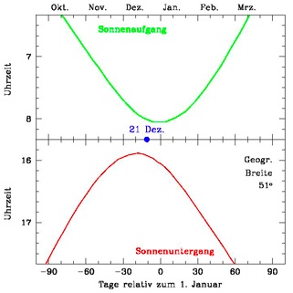 Die Grafik zeigt die Zeiten von Sonnenauf- und Sonnenuntergang im Winter auf der Nordhalbkugel. Es spielen drei Effekte eine Rolle. Erstens: Die Neigung der Erdrotationsachse sorgt für immer kürzere Tage vor dem 21. Dezember und allmählich länger werdende Tage nach dem 21. Dezember. Zweitens: Wegen der Zeitgleichung läuft unsere normale Uhr im Herbst vor (also abends früher dunkel, morgens früher Licht) und nach dem 2. Januar (nach dem Perigeum) ist es umgekehrt (also abends später dunkel, morgens später Licht). Drittens: Die Erde bewegt sich in der Bahn um die Sonne und die Eigenrotation der Erde zeigt in die gleiche Richtung. Daher kommt es in der Nähe des Perigeums zu einer Verzögerung der Morgendämmerung, da die Rotation der Erde relativ zum Sonnenaufgang die verzögernden Effekte der Fortbewegung der Erde nicht kompensiert. Zusammen führt dies zu einer Verschiebung der Zeit des frühesten Sonnenuntergangs (etwa am 10. Dezember) gegenüber der Zeit der spätesten Sonnenaufgang (etwa am 1. Januar). Bild Autor; Daten aus Ahnerts Sternfreunde, Uhrzeiten für Zentraleuropa. |