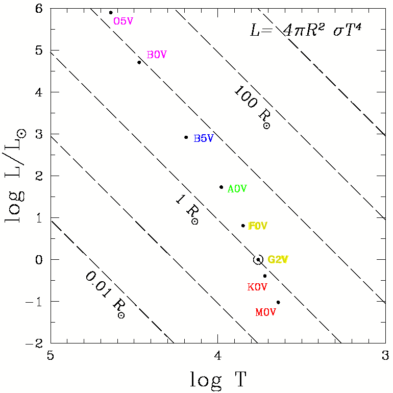 In derartigen Betrachtungen werden die Parameter L und R immer in Einheiten der Leuchtkraft und des Radius der Sonne gegeben: Lo und Ro. Dabei ist "o" das Symbol für die Sonne. Man verwendet also Einheiten von L/Lo und R/Ro. Bei der Temperatur T wird diese Art der Normierung nicht gemacht.