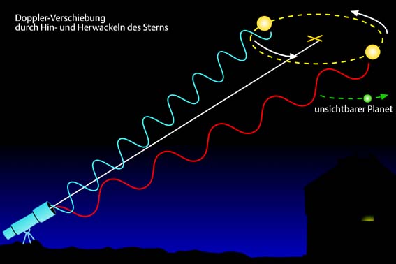 Sehen wir ein Planetensystem von der Seite, dann bewegt sich der Stern in Folge dessen auf uns zu und von uns weg. Wenn er sich auf uns zu bewegt, dann erscheinen die in diesem Moment ausgesandten Lichtwellen im Spektrum zusammengestaucht und somit blauer. Wenn der Stern sich wieder entfernt, werden die Lichtwellen auseinandergezogen und damit röter. Dies ist der Dopplereffekt. Wenn ein Stern von einem Planeten umkreist wird, zeigt seine Radialgeschwindigkeit eine kleine periodische Schwankung auf (wobble = schwanken, wackeln). Falls es sie gibt, so schliesst man auf das Vorhandensein eines Planeten. Da diese Geschwindigkeitsänderungen nicht sehr gross sind, sind Planeten kaum aufzufinden. In den letzten Jahren hat man dennoch bei etwa zwei Dutzend Sternen Planeten entdeckt (oder viel mehr, siehe exoplanets.org).