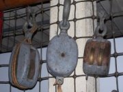 Rechts: Katrollen (blokken), gefotografeerd in 2011