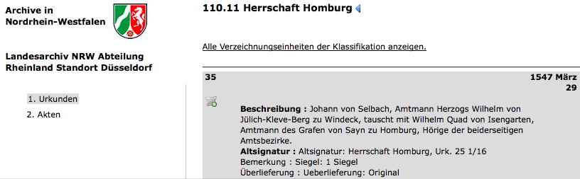 A= regest uit archieven.nl B= regest uit de archieven Bylandt. (Nationaal Archief, Den Haag, Collectie Familie Van Bylandt, 1277-1898). C= gedigitaliseerde akten uit het archief Cartago NRW = NRW Archiven. De codering van de oorkondes uit de volgende archieven is jjjjmmdd- dan initialen, een thema, en tenslotte UrkFHWn (n=2 of 3) met volgnummer: UrkFHW2 = Landschaftsverband Rheinland: Inventar des Urkundenarchivs der Fürsten von Hatzfeld-Wildenburg zu Schönstein/Sieg, Band 2; J.Kloft (Bearbeiter) UrkFHW3 = idem, Band 3. In de transliteraties in UrkFHW wordt Johans naam steeds "Johann von Seelbach" geschreven !