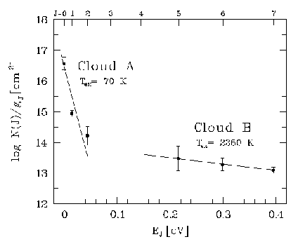 Die Fähigkeit des Wasserstoffmoleküls Photonen im Fern-UV Bereich des Spektrums zu absorbieren wird sichtbar in Spektren von Sternen, die als Hintergrundlichtquelle das interstellare Gas durchleuchten. Darin treten charakteristische Absorptionsstrukturen auf, je nach dem Anregungszustand des H2-Moleküls (siehe Seite zu H2). Bei grösseren Mengen an H2 sind die Moleküle über die unterschiedlichen Anregungszustände verteilt, im Normalfall aber gemäss der Boltzmannstatistik. Dies bedeutet, dass in wirklich kaltem Gas nur die unteren Zustände besetzt sind, in wärmeren Gas hingegen auch die Zustände höherer Energie. Damit wird klar, dass eine Messung der Verteilung der H2-Moleküle über seine Energiezustände Information über die Temperatur des betreffenden Gases liefert.