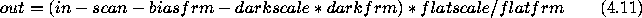 Here, out is the output frame, in is the input frame, scan is the overscan bias value or frame, biasfrm is the master bias, darkfrm and darkscale are the master dark frame and scaling factor, and flatfrm and flatscale are the master flat field and the mean value of the flat field. In the COMPUTE biasfrm and darkfrm can also be constants.