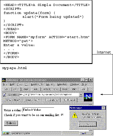 Web browsers such as Netscape Navigator 2.0 (and later versions) can interpret client-side JavaScript statements embedded in an HTML page. When the browser (or client) requests such a page, the server sends the full content of the document, including HTML and JavaScript statements, over the network to the client. The client reads the page from top to bottom, displaying the results of the HTML and executing JavaScript statements as it goes. This process, illustrated in Figure 1.2, produces the results that the user sees.