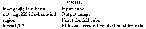 Having produced the smoothed cube, you could then drop every other channel (as they are no longer independent) with imsub . In the example, we assume the velocity axis is the third axis.