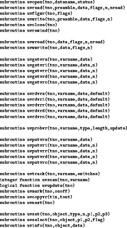 There is a ``miriad'' of uv routines. The routines used to access and manipulate a uv data set are given in the following table.