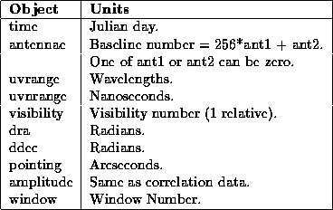 SelProbe returns information about whether uv data with a particular parameter value may have been selected. It does not guarantee that such data might exist in any particular data file. It also has the limitation that information is not present to convert ``uvrange'' and ``uvnrange'' calls into each other. These should be treated with caution. The sels array is the intermediate form returned by SelInput, and value is a double precision value, giving the parameter value that is of interest. The object argument determines the meaning (and the units) of this value. Possible values are given in Table 2.6.