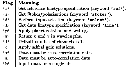 The uvDatInp routine is called to setup the uvDat routines, and to retrieve the user parameters. The key argument (a character string) gives the name of the keyword to use to retrieve the input visibility data-set name. Normally it will be 'vis'. The flags argument specifies what processing steps are to be performed, and which user parameters to retrieve. The flags argument is a character string, each character representing a processing step or parameter retrieval request. The legitimate characters are given in Table 2.7.